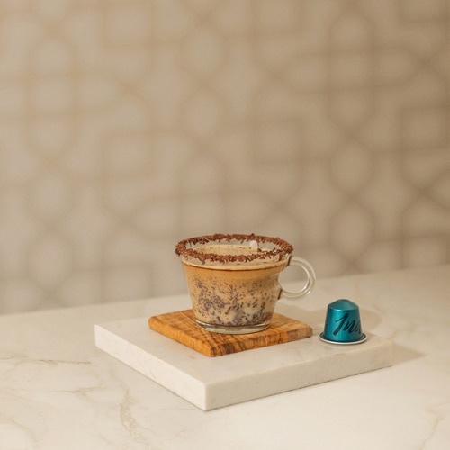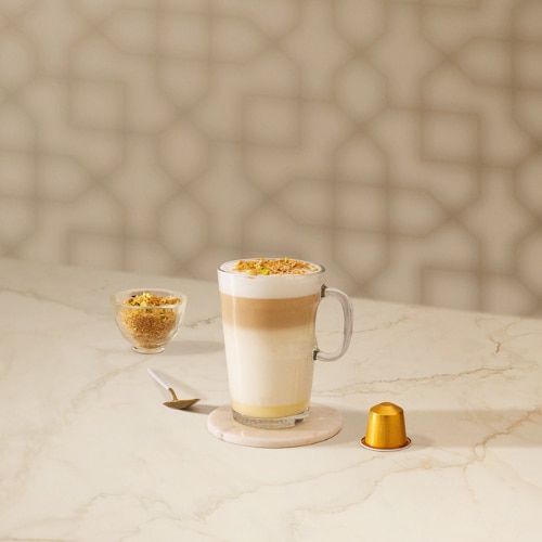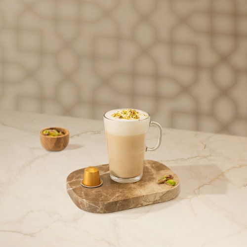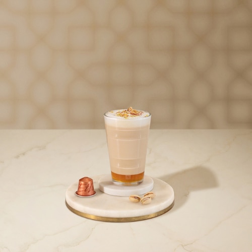 ISPIRAZIONE PALERMO KAZAAR – 40ML COLD MILK – 60ML CINNAMON POWDER – A PINCH NESPRESSO DARK CHOCOLATE – 1 PIECE CRUSHED PISTACCHIOS – A PINCH WHIPPED CREAM