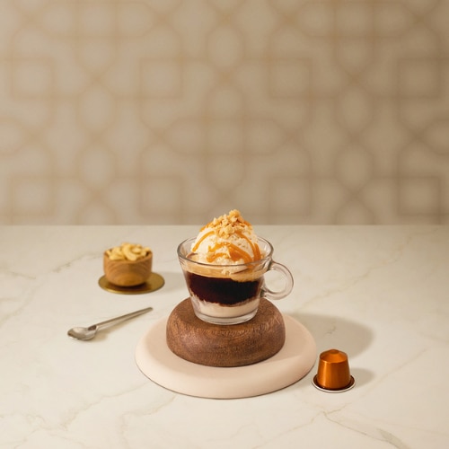 PREPARATION- PREPARE THE SALTED CARAMEL SAUCE AND THE COLD MILK INTO THE NESPRESSO BARISTA DEVICE OR NESPRESSO AEROCCINO. CLOSE THE LID, SELECT THE «LATTE MACCHIATO» RECIPE ON THE DEVICE AND PRESS THE START BUTTON.