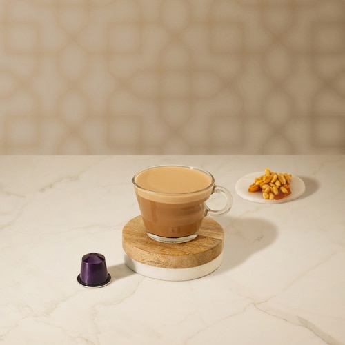 PREPARATION- PREPARE THE TOFFEE NUT SYRUP WITH THE COLD MILK INTO THE NESPRESSO AEROCCINO OR THE NESPRESSO BARISTA DEVICE. CLOSE THE LID, SELECT THE «LATTE MACCHIATO» RECIPE ON THE DEVICE AND PRESS THE START BUTTON.