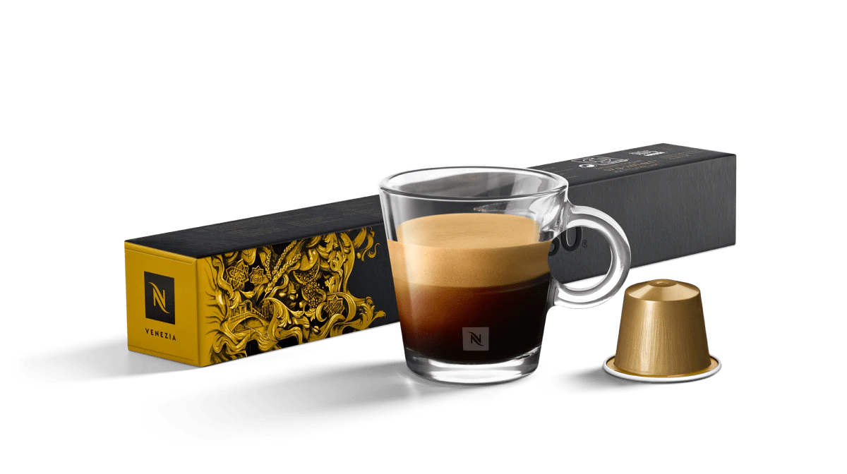 As a cappuccino, the rounded smoothness and sweetness of Venezia are amplified in a creamy cup that is not short in coffee taste.
