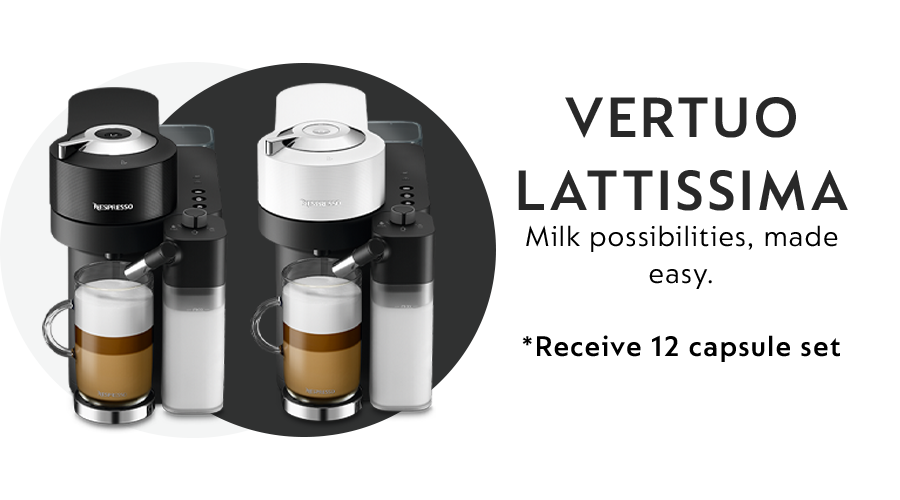 From your every coffee wish to your cup, there’s only one touch with Vertuo Lattissima.With its integrated milk solution, the ideal coffee and milk moment is at your fingertips. Simply press the button to enjoy your coffee black or with foam. For small Cappuccinos to large Latte Macchiatos, all available at any time of the day in one automated system. And with a wide array of coffee varieties and cup sizes to choose from, less effort means more pleasure.