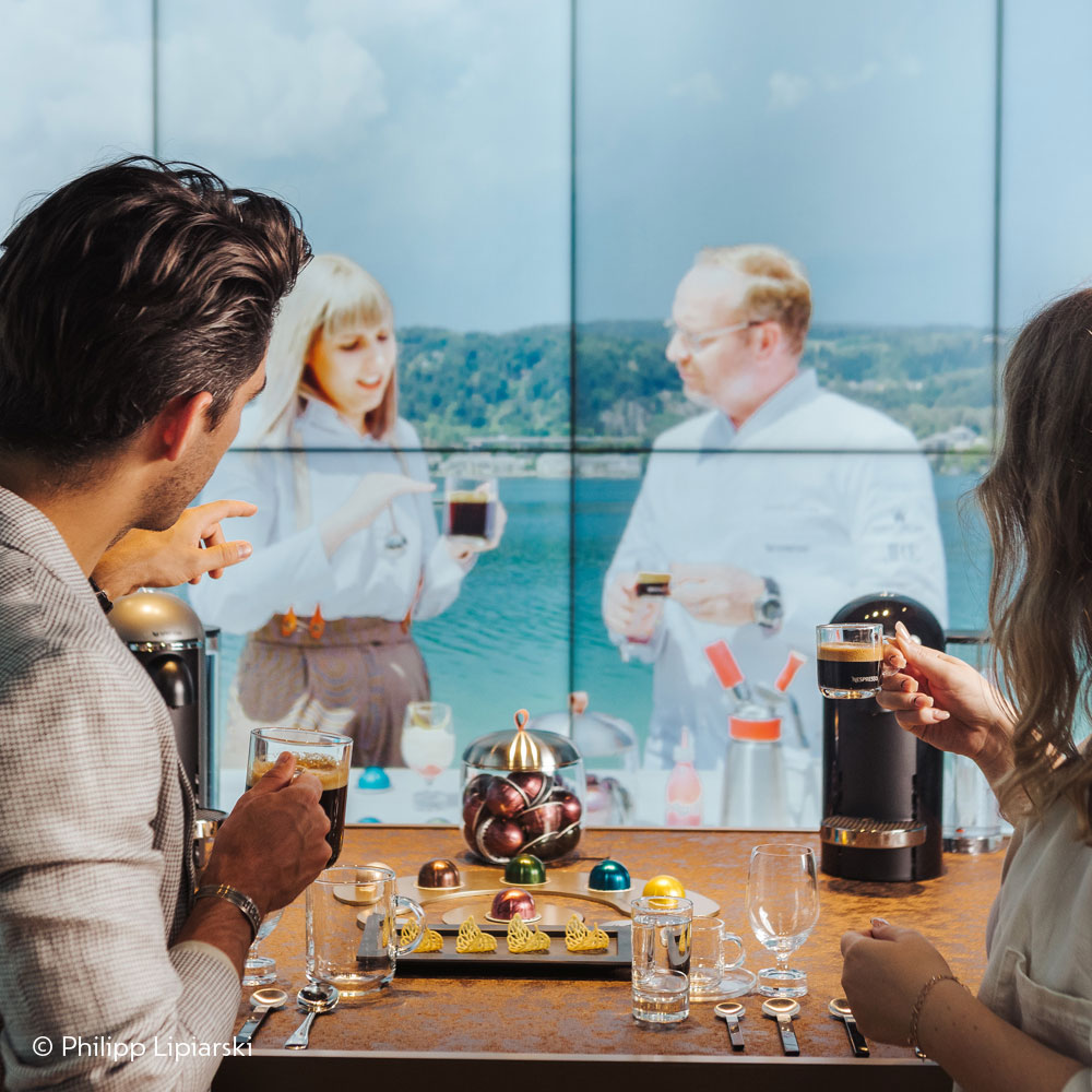 Gemeinsam mit dem 4-Hauben-Koch Hubert Wallner bereiten Sie virtuell ein von ihm kreiertes Dessert zu und erhalten eine Einführung in die Kunst der Kaffeeverkostung. Abschließend genießen Sie im Immersive Room das zubereitete Dessert mit einer Tasse Nespresso Kaffee in der eigens gewählten, virtuellen Location. Die Immersive Experience im Nespresso Atelier schafft somit ein noch nie dagewesenes, interaktives Kaffeeerlebnis für jeden Geschmack.