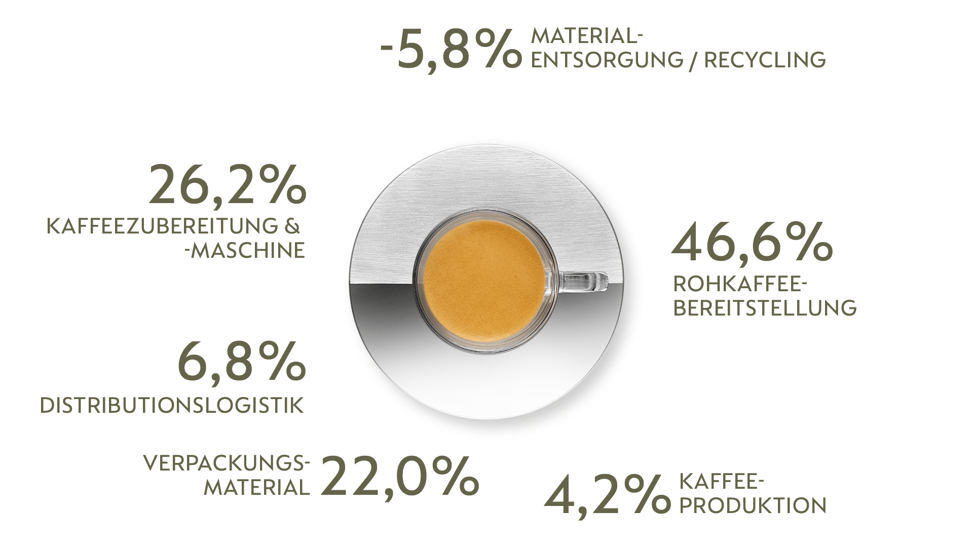 Jede Nespresso Kapsel enthält exakt die Menge Kaffee, die man für eine Tasse benötigt. Bei der Zubereitung mit anderen Systemen wie beispielsweise Vollautomaten oder Filtermaschinen wird oft mehr gemahlener Kaffee verwendet als für eine Tasse notwendig ist oder mehr Kaffee zubereitet als getrunken wird. Die verbrauchte Kaffeemenge ist deshalb relevant, da die größte Auswirkung einer Tasse Kaffee auf die Umwelt – unabhängig vom Zubereitungs-System – bereits bei der Bereitstellung des Rohkaffees entsteht, also vom Anbau des Grünkaffees bis zum Transport in die Produktionszentren. Bei modernen Nespresso Maschinen ist auch der Verbrauch von Energie (durch eine Abschaltautomatik) und Wasser optimiert.