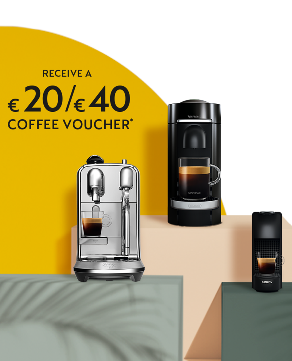 The voucher is only valid for coffee orders. The voucher amount will be deducted from the invoice amount of your order. The minimum order value for the redemption of the € 20 voucher is € 22 and for the redemption of the € 40 voucher is € 44. The € 20 voucher can only be redeemed on capsules for the ORIGINAL system and the € 40 only on capsules for the VERTUO system. The capsules from the two systems cannot be combined. The General Terms and Conditions of Nespresso apply to any redemptions. No exchange or cash redemption. As proof of purchase, Nespresso requires a copy of the purchase invoice and the serial number of your machine.