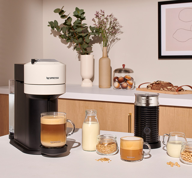Preparar los diferentes tipos de café con cafeína es cuestión de segundos. Un buen espresso o lungo está a un clic con las máquinas Original (entre 50 y 120 mg de cafeína, según la variedad) y el tamaño de taza que prefieras, con abundante crema, en el sistema de cafeteras Vertuo.