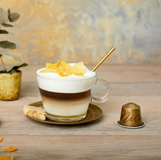 Vierte la leche espumeada en la taza y extrae 40ml de Nespresso Chiaro encima.