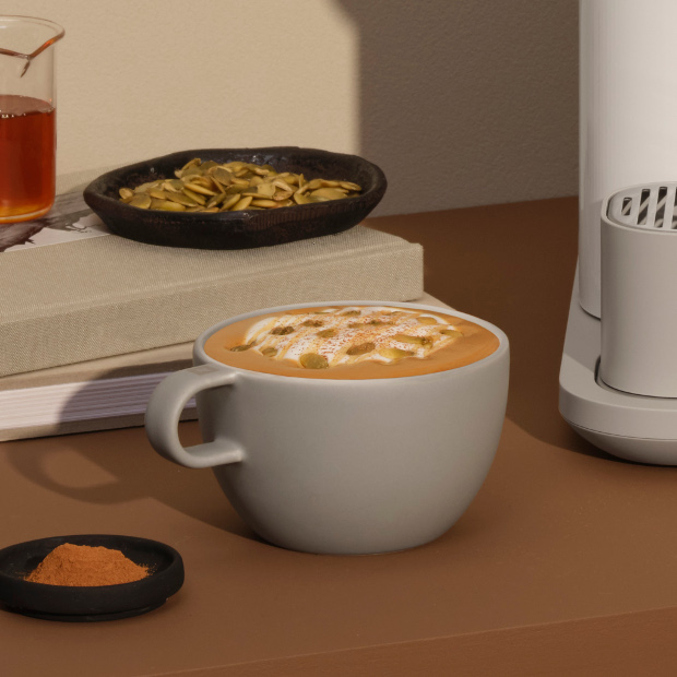 En una taza Vertuo Alto, coloca 7 cubitos de hielo (de 30 g cada uno), añade 20 ml de sirope de caramelo y vierte 80 ml de bebida de almendra.