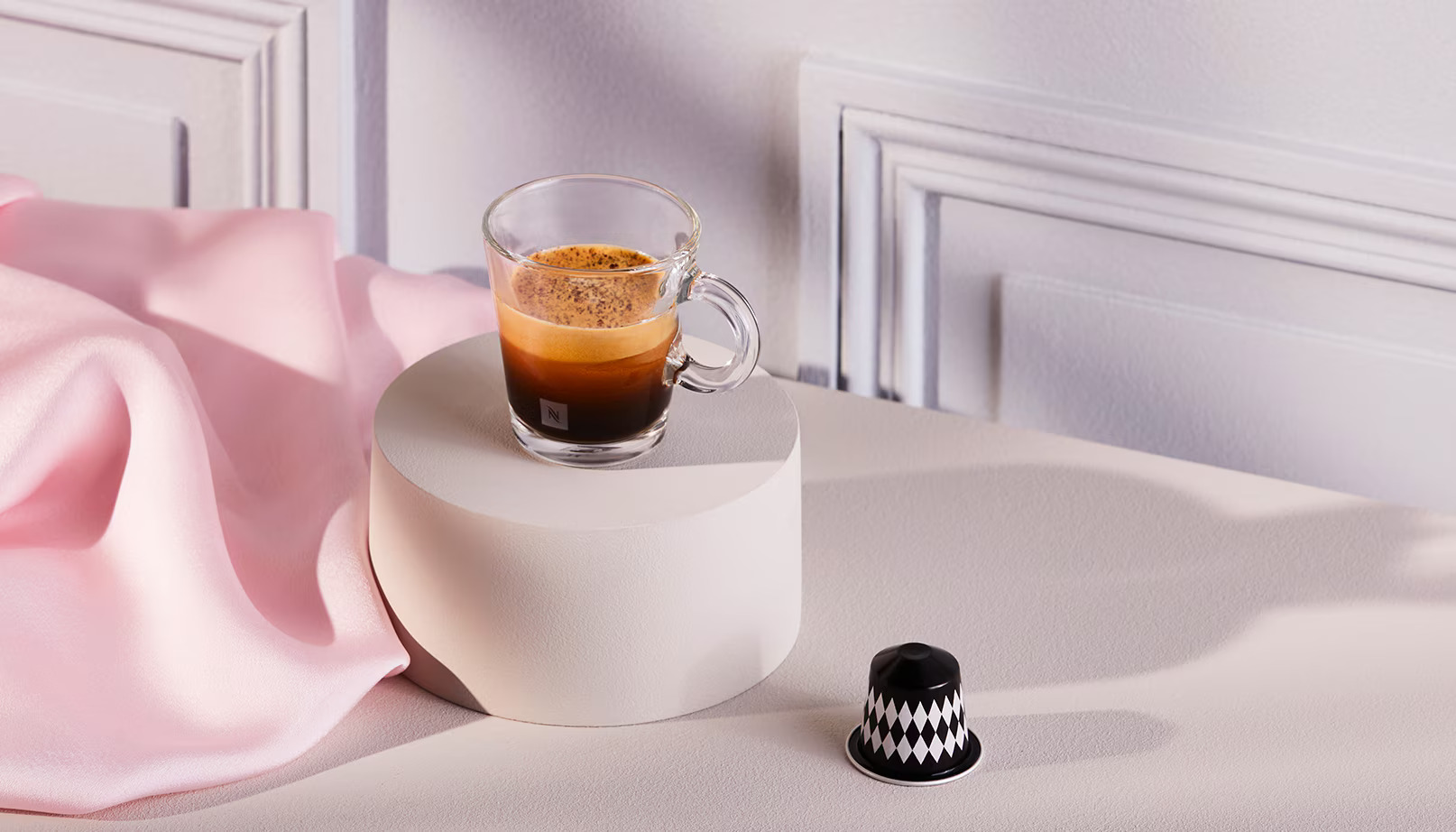 Rompe una onza de Nespresso Dark Chocolate en cuatro partes y colócalo en el fondo de una taza View Espresso.