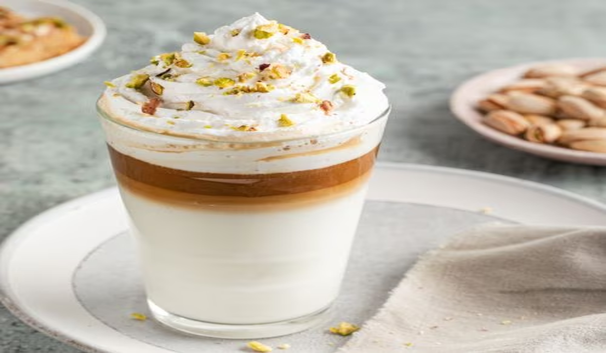 3.GARNISH WITH WHIPPED CREAM AND A PINCH OF CRUSHED PISTACCHIO.