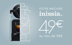 Votre machine Inissia à 59€ : soit 40€ de remise immédiate pour tout achat d’une machine Inissia effectué exclusivement dans le réseau Nespresso* (hors éco-participation).