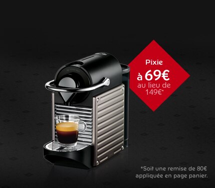 Votre machine Pixie à 89€ : soit 60€ de remise immédiate pour tout achat d’une machine Pixie ou Pixie Clips (hors Pixie Clips sérigraphiées en édition limitée) effectué exclusivement dans le réseau Nespresso* (hors éco-participation).