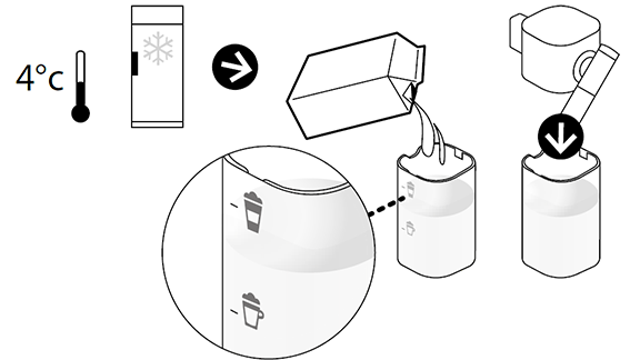 - הערות: • מערכת החלב לא תוכננה לפעול עם חלב צמחי (אורז וכו'). • לקצף חלב מושלם, מומלץ להשתמש בחלב 3% בטמפרטורת מקרר (כ 4- מעלות צלזיוס). • מערכת הקצפת החלב אינה פועלת עם מים. • כל החלב הנמצא במיכל החלב ישמש להכנת המתכון. מלא את מיכל החלב עד אחד משני הרמות המסומנות: קפוצ'ינו לאטה מקיאטו . סגור את מיכל החלב וחבר את מערכת הכנת מתכוני החלב למכונה. המכונה תתחמם במשך 15 שניות (נורות יהבהבו).
