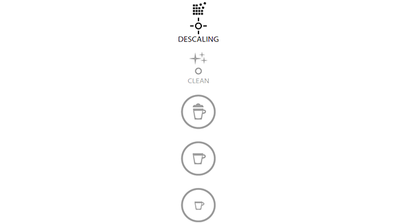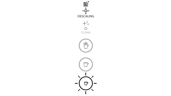 - המכונה עוברת למצב ניקוי אבנית. התראת ניקוי האבנית מהבהבת בכתום למשך כל תהליך הניקוי. כפתור האספרסו מואר בלבן.