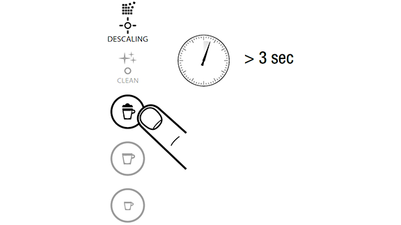 - הערה: יציאה ממצב תפריט תתבצע באופן אוטומטי לאחר 30 שניות' במידה ולא מתבצעת שום פעולה. ניתן לצאת ממצב זה ע"י לחיצה על כפתור החלב למשך 3 שניות. הדלק את המכונה. הערה: הוצא את מיכל החלב. לחץ במקביל על כפתור החלב למשך 3 שניות לכניסה לתפריט: נורות התראת ניקוי אבנית וניקוי יהבהבו.