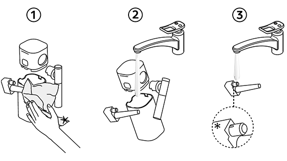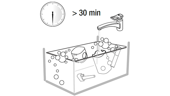 - השרה את כל החלקים במים חמים (40°C לערך) יחד עם סבון כלים למשך 30 דקות לפחות, שטוף עם מי שתיה.
