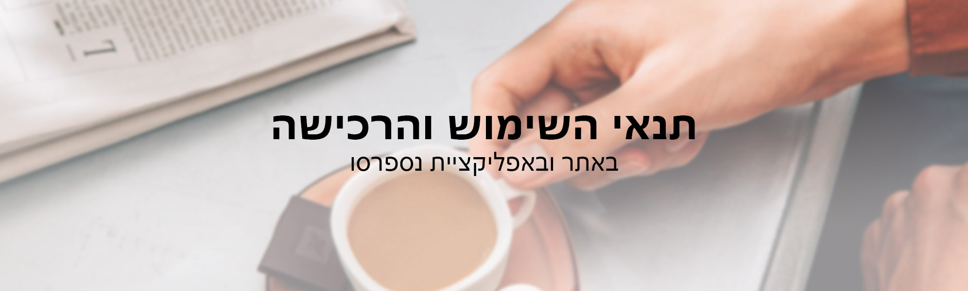 5.1. נספרסו מוכרת את מוצרי הקפה והמוצרים הנלווים אליהם אך ורק ללקוחות רשומים שלה. לפיכך, רכישה של קפה ומוצרים נלווים תתאפשר רק לאחר הרשמה כלקוח. ניתן להירשם כלקוח דרך האתר או דרך התקשרות למחלקת שירות הלקוחות במספר הטלפון 03-9241334 / 1800-255-355 / 2500*.
