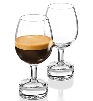 Set of 2 tasting glasses in crystal (Ø 5,7 cm / height 12 cm), concentrating the powerful roasted notes of the Intense Espresso Grands Crus (Intensity 7 and above)
