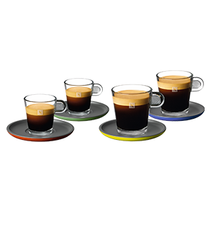 Enjoy Espressos and Lungos in our iconic cups, made with clear tempered glass. Each cup is paired with a melamine saucer splashed with a touch of color.