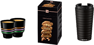 זוג ספלי טאץ' אספרסו, ספל קפה לדרך וחבילת עוגיות קנטוצ'יני