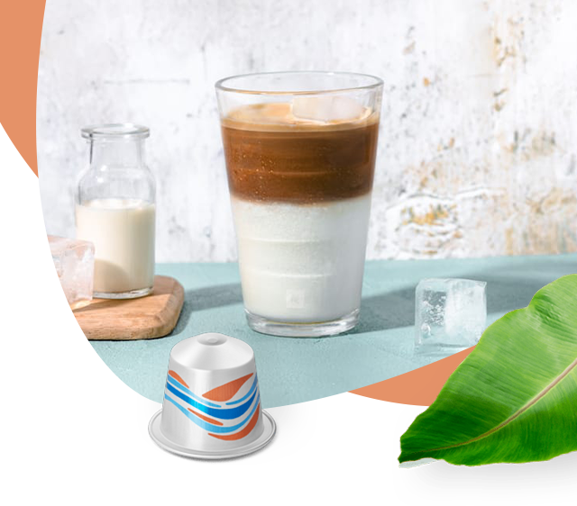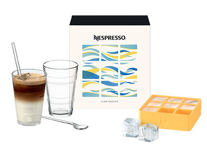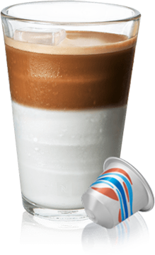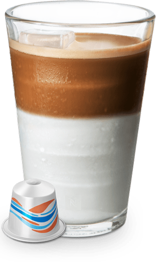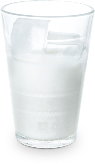 מתכון מוצלם של הכנת קפה קר על חלב - מלאו את ספל הנספרסו שלכם ב-4 קוביות קרח, הוסיפו 120 מ"ל חלב קר, מיזגו 25 מ"ל קפה.
