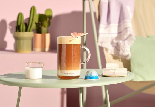 سيسايد بريز | وصفة قهوة أوريجينال | نسبريسو الكويتوصفة ماكياتو مثلجة تجمع نكهات جوز الهند والخزامى لمتعة صيفية على شاطئ البحر وأنت تتأمل الأمواج. -