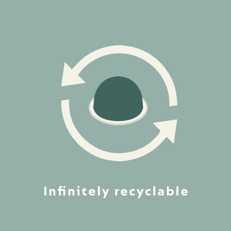 Nespresso use aluminium for our capsules as it protects the quality of our coffee and it's infinitely recyclable. Aluminium comes with multiple functional and environmental benefits that make it an excellent choice for our capsules.
