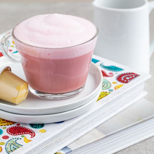 PREPARATION- PREPARE THE SOY MILK, THE BEETROOT JUICE AND THE CARDAMOM POWDER INTO THE NESPRESSO BARISTA DEVICE OR NESPRESSO AEROCCINO. CLOSE THE LID, SELECT THE «CAPPUCCINO» RECIPE AND PRESS THE START BUTTON.
