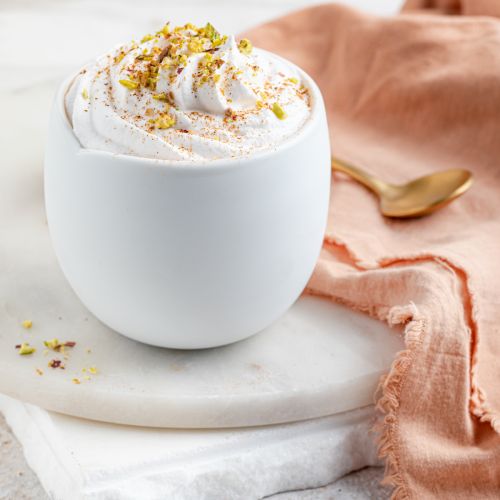 - GARNISH WITH WHIPPED CREAM AND A PINCH OF CRUSHED PISTACCHIO.