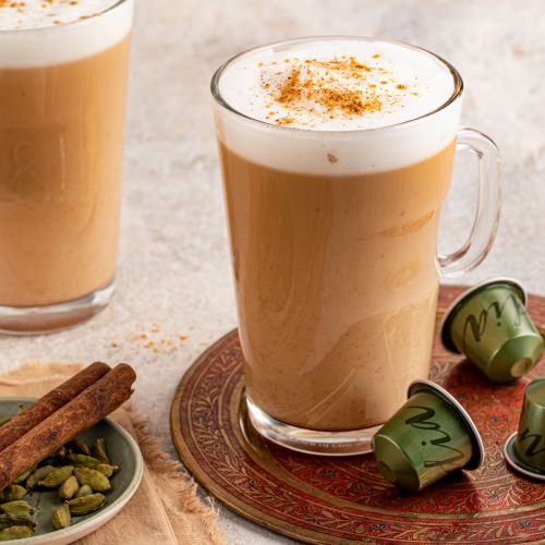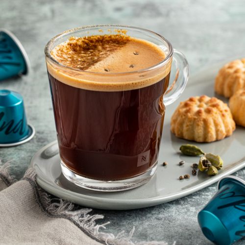 PREPARATION- Prepare the cardamom syrup with the cold milk into the nespresso barista device or nespresso Aeroccino. Close the lid, select the «cappuccino» recipe on the device and press the start button.