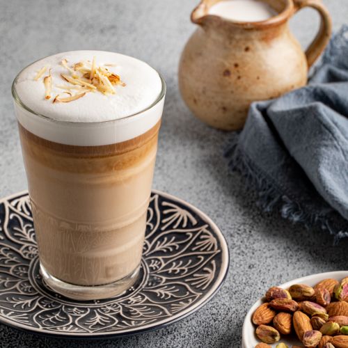 - GARNISH WITH WHIPPED CREAM, CRUSHED PISTACCHIOS AND CINNAMON POWDER.