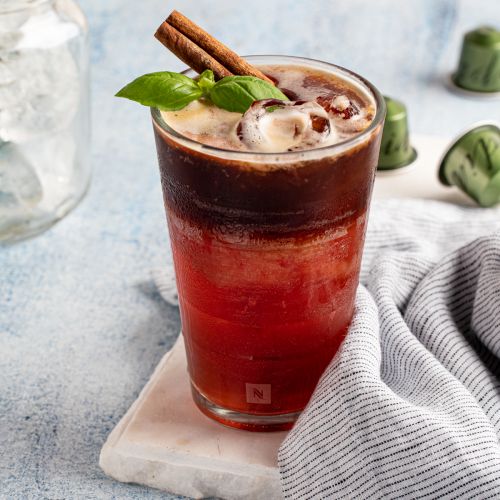 - GARNISH WITH A CINNAMON STICK AND BASIL LEAVES.