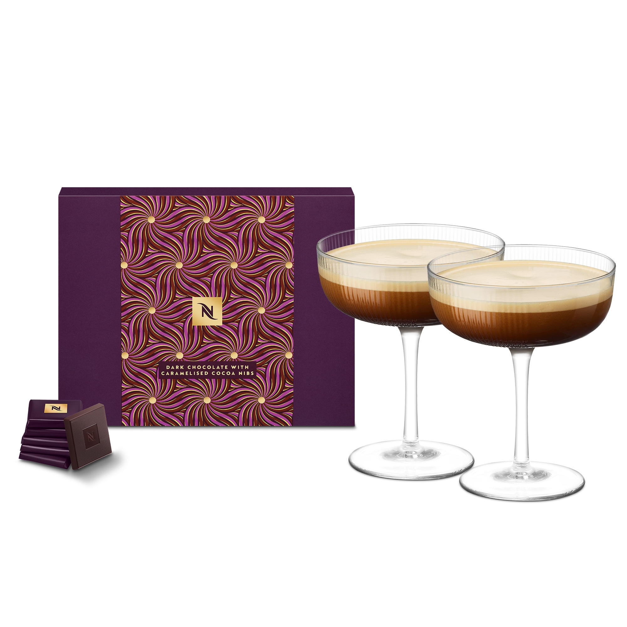 Dark Chocolate with Cocoa Nibs & 2x Barista Mixologist Stemmed Glass