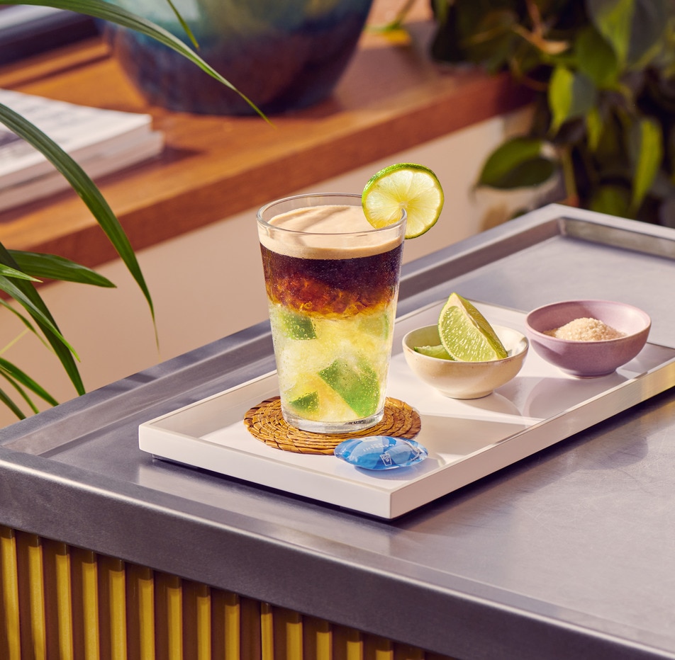 - Into a View recipe glass, put 16 cubes of fresh non treated lime (60gr), 8gr of brown sugar. Muddle it.