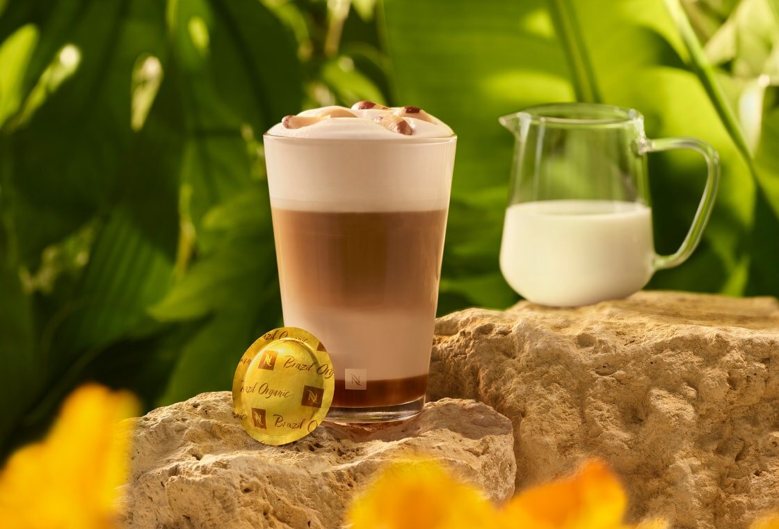 - Pour the milk into your device and press for cold foam. Pour the cold milk foam into the glass and then extract one espresso (40 ml) over it. / With the Nespresso Momento or Aguila machines: Place the glass under the outlet and select the Latte Macchiato mode.