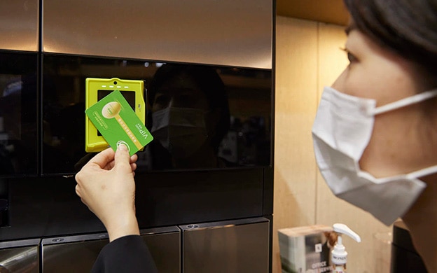 お好みのコーヒーメニューを選び、キャッシュレス端末にICカードをかざして決済を行うと、コーヒーカプセルが選べます。カプセルをマシンにセットすると、淹れたてのコーヒーメニューが完成します。
