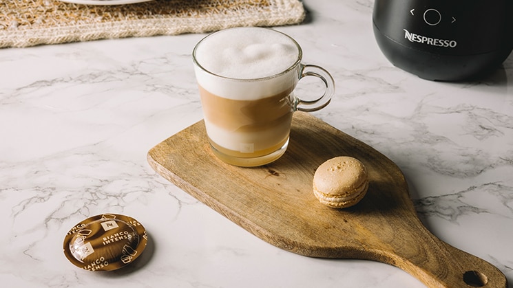 2. 2. Pour 100ml of hot Oat milk over the syrup and extract 40ml (espresso) of Bianco Intenso over the top.