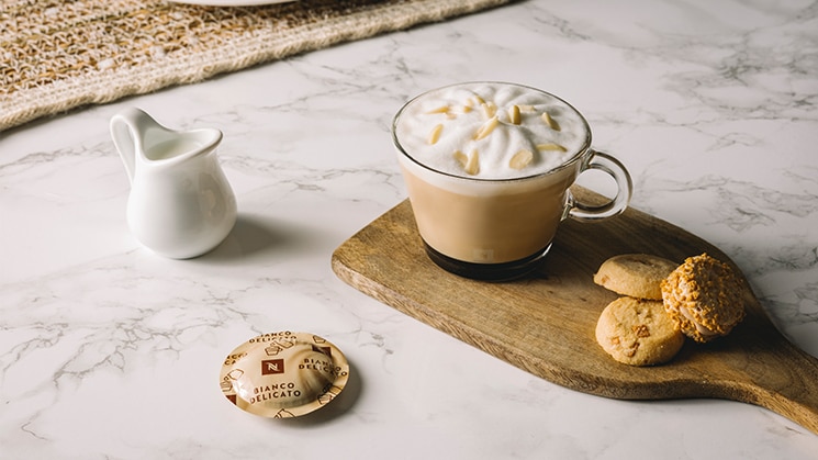 An Italian classic medium sized beverage traditionally prepared with an espresso, hot milk and topped with a layer of frothed milk. In this version, the cappuccino can easily be enhanced with crushed almonds and a caramel syrup.
