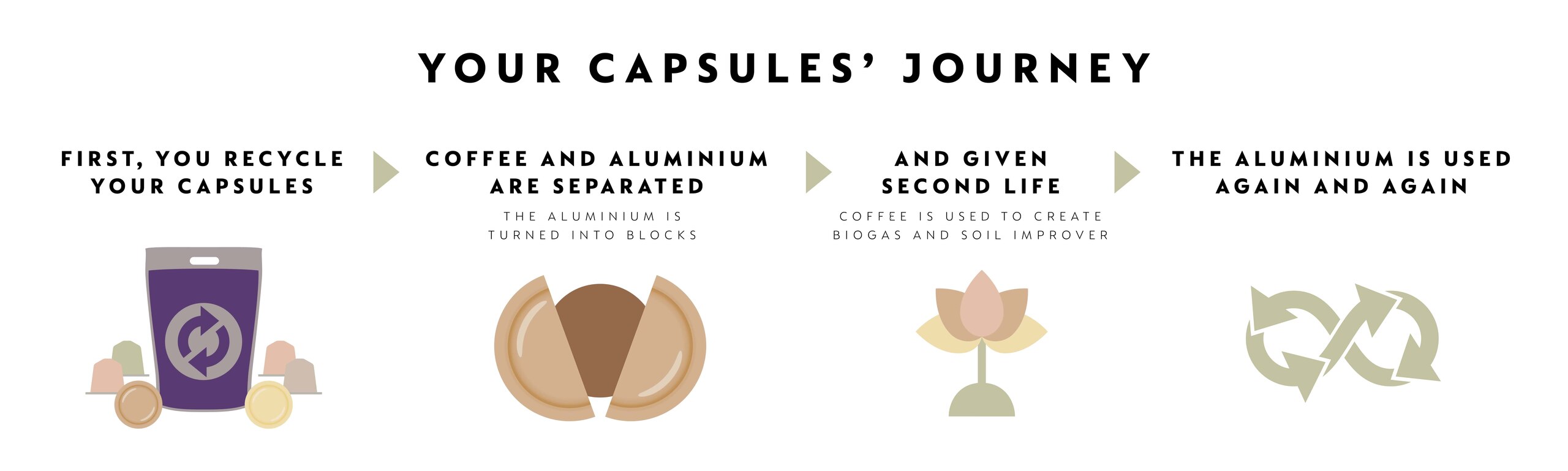 After you have returned your capsules through any of our easy methods, they are sent to our specialist recycling plants, where the coffee is removed from the aluminium. The aluminium is smelted and recycled into new products, such as beverage cans. The coffee is used to create renewable energy and soil improver. Our recycling bags are made from more than 80% recycled content and are also recycled.