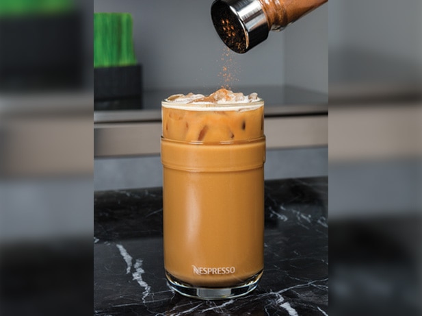 Primeiro, coloque gelo no copo de receitas. Agora, num copo separado, misture o chai, a canela ea o leite de arroz até dissolver. Adicione o café extraído e agite. Despeje a mistura sobre o gelo e decore com um pouco de canela