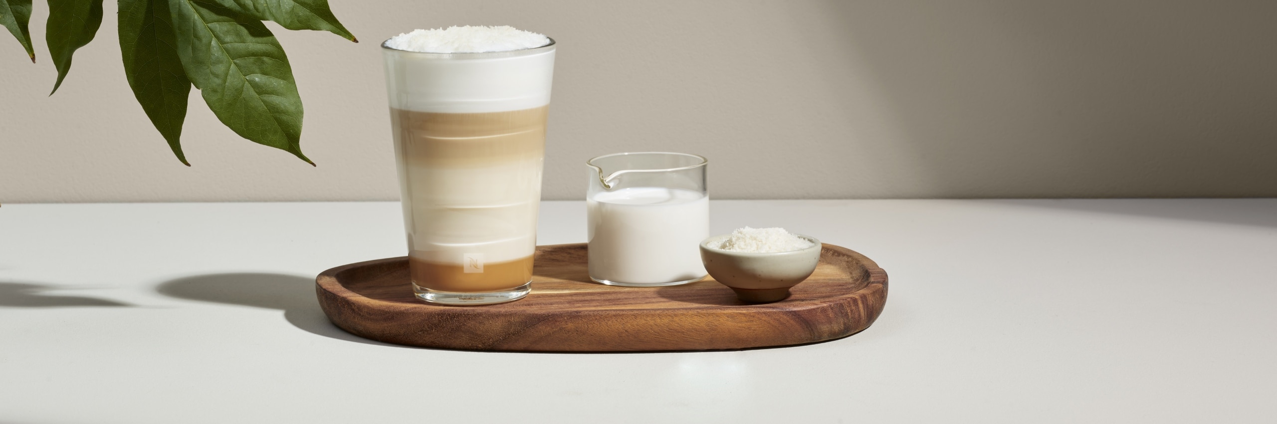 Coloque 4 cubos de gelo (30 gr cada) no seu copo de receitas Nespresso e adicione 10 ml de xarope de coco.