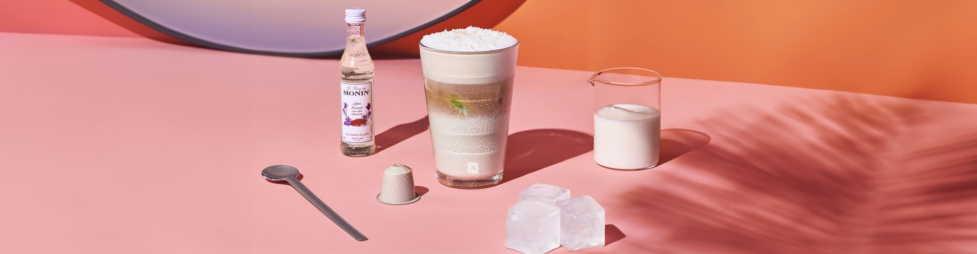 Brew a capsule of BARISTA CREATIONS COCONUT FLAVOUR OVER ICE into the glass.