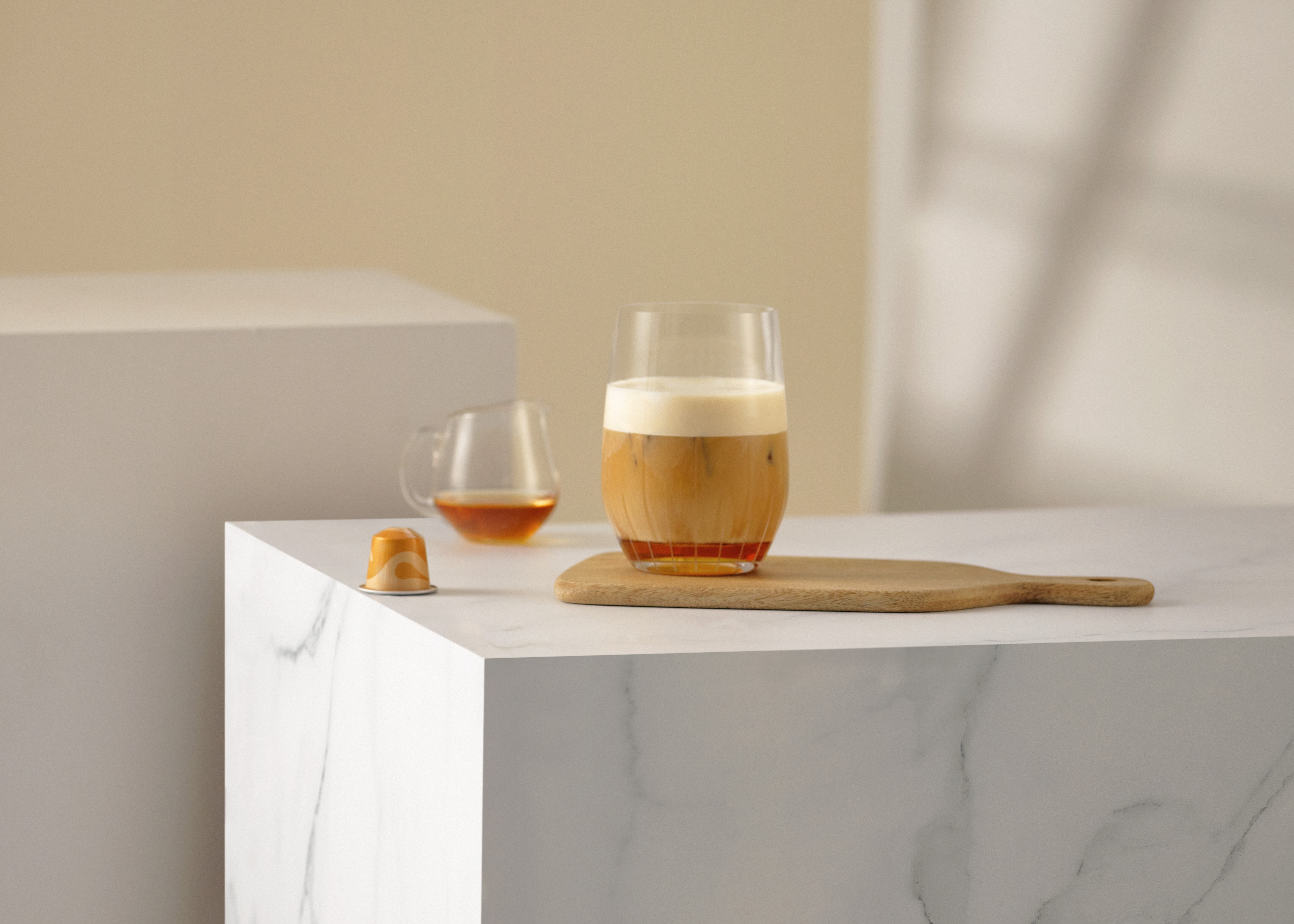 Extraire 1 capsule de Caramello par-dessus la glace, puis remuez pour refroidir la boisson.