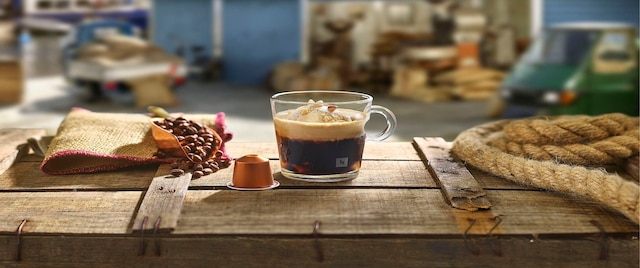 首先,将一球焦糖口味冰淇淋放入View Lungo咖啡杯中。