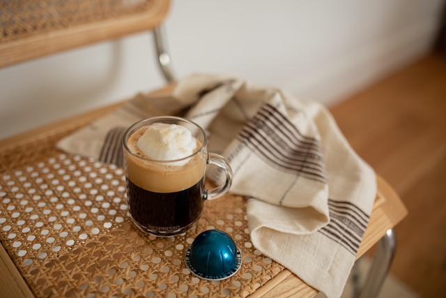 在奶泡机中加入冷藏牛奶。盖上盖子,按下“拿铁玛琪雅朵”按钮。将热奶泡用汤匙加到咖啡顶部。