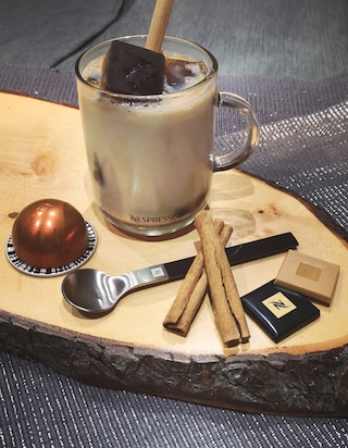 Eine Kapsel des Caramelizio in einer Tasse zubereiten, auskühlen lassen und anschließend in eine Nespresso Eiswürfelzubereiter hineinfüllen. Am besten über Nacht im Tiefkühlfach lagern oder so lange, bis Eiswürfel aus dem Kaffee entstanden sind.