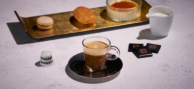 一小塊黑朱古力片,誘發出鮮奶濃縮咖啡的香濃芬芳,構成夢幻般的法式 café noisette 享受。