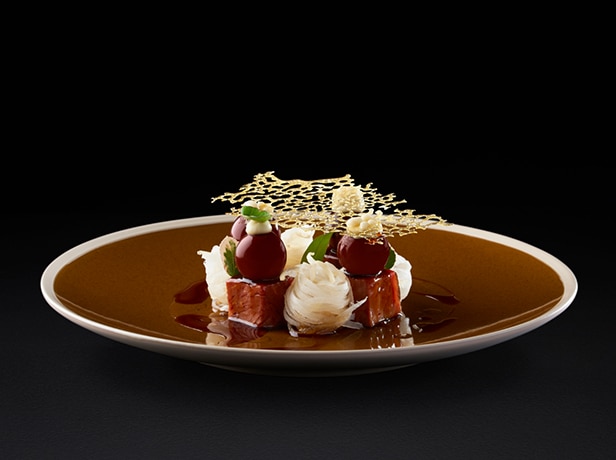 A tálalás előtt kávézselét készítünk: a Vanilio kávéhoz hozzáaadjuk a Cassis likőrt, a fehér balzsamecetet, egy kevés sót, majd a kappapor segítségével felforraljuk és besűrítjük. A hideg kacsamáj pástétomból cseresznyeszem nagyságú golyókat formázunk, és a meleg kávézselébe kimártjuk.