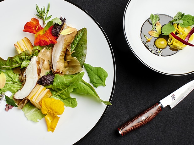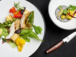 Finely slice the squash with a mandolin. Roll up the slices into rosettes. Drizzle salted butter over them and cook in a preheated oven at 200°C for 3 minutes.