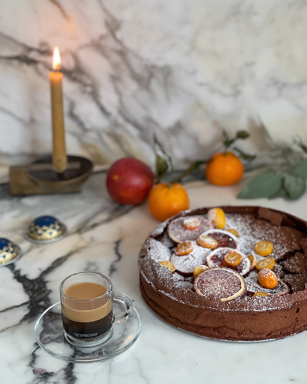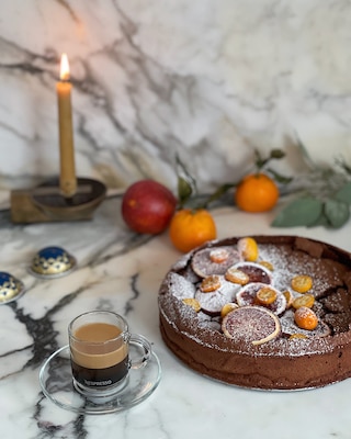 Preheat the oven to 350°F (175˚C). Grease a 9-inch (23cm) springform pan with butter, fit the bottom with parchment paper, and grease the paper. Combine the chocolate and butter in a large metal bowl, set it over a saucepan of simmering water, stir frequently until the chocolate and butter are melted. Remove from the heat and let the mixture cool down completely. Whisk in the vanilla extract, salt, and 65g of sugar. Add the egg yolks one at a time, whisking well after each addition. Whisk in the flour. In a medium bowl, use an electric mixer set at medium-high speed to beat the egg whites together with a pinch of salt. Beat until soft peaks form. Add the remaining 65 g of sugar a little at a time, and continue beating the whites until they hold stiff, glossy peaks. Whisk about a quarter of the egg whites into the chocolate mixture, then use a rubber spatula to gently fold in the remainder. Pour the batter into the springform pan, spreading it evenly across the pan. Bake for 28 to 30 minutes, or until the cake’s center is slightly gooey and its edges pull away from the pan.