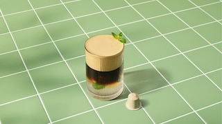 In a Nespresso Old Fashion Glass, put 3 Nespresso ice cubes. Add 3 fresh mint leaves and 5ml of Vanilla syrup.
